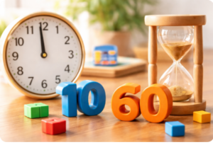 時間は60進法のルールで動きますが、ふだんの数字は10進法が基本です。 ここをセットで理解すると、「どこで考え方を切り替えるか」がもっとハッキリします。