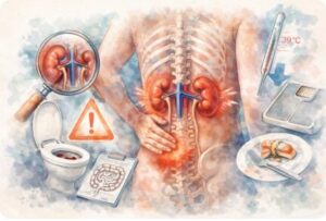 腎臓の炎症などでは、腰〜わき腹の痛みと発熱が同時に出ることがあります。