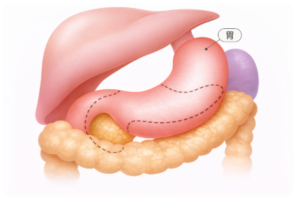 (※点線部分が胃の後ろに隠れた膵臓)