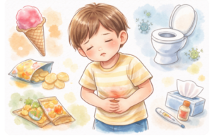 食事・便通・動きのスイッチと、吐き気/発熱/冷や汗などの危険サインで判断しましょう。
