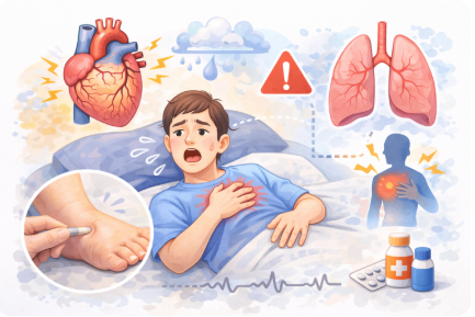 3. セット症状は?(むくみ、発熱、咳、ゼーゼー、胸痛、眠気、いびきなど) → 「横になって苦しい」「足のむくみ」などの組み合わせは受診目安の項目としても挙げられています。